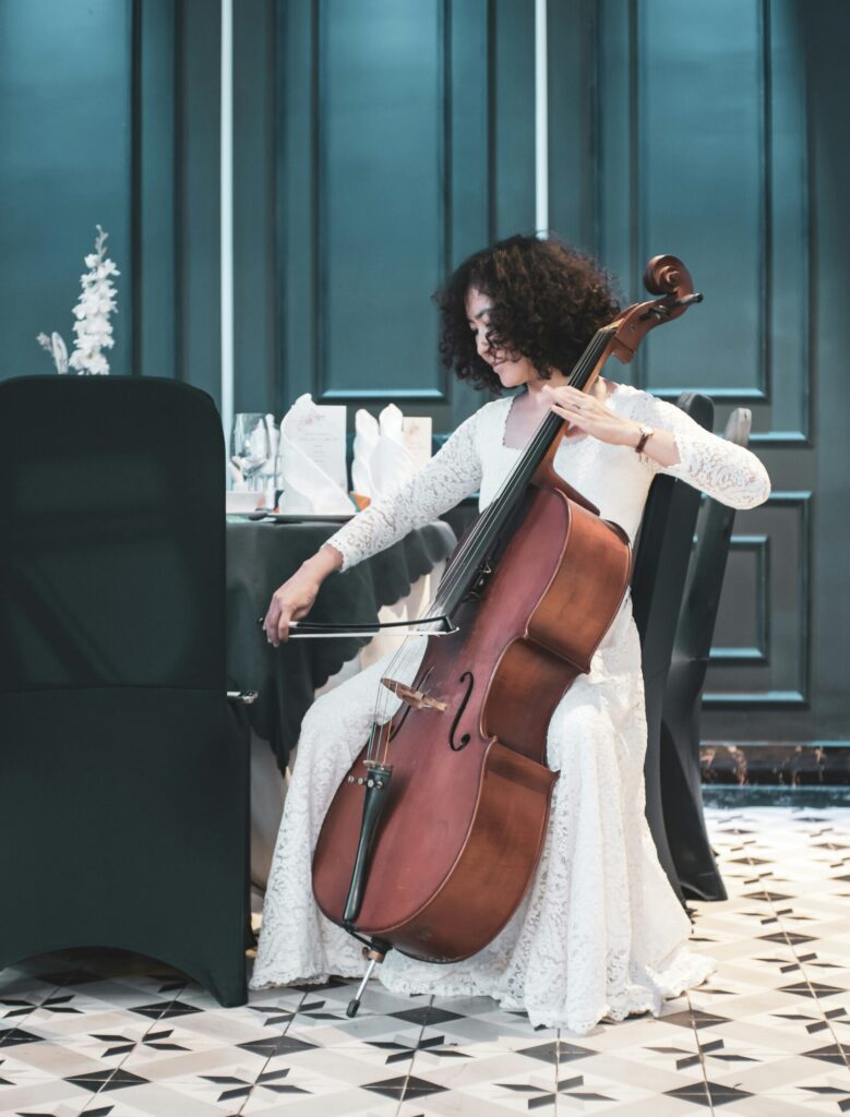 Le violoncelle fait partie de la grande famille des instruments à cordes frottées. Comme le violon et l’alto, il se joue avec un archet, mais se distingue par sa taille (environ 1,2 mètre de long) et sa tessiture, qui descend bien plus bas. On le tient entre les genoux, posé au sol sur une pique métallique : une position unique, coeur contre coeur.