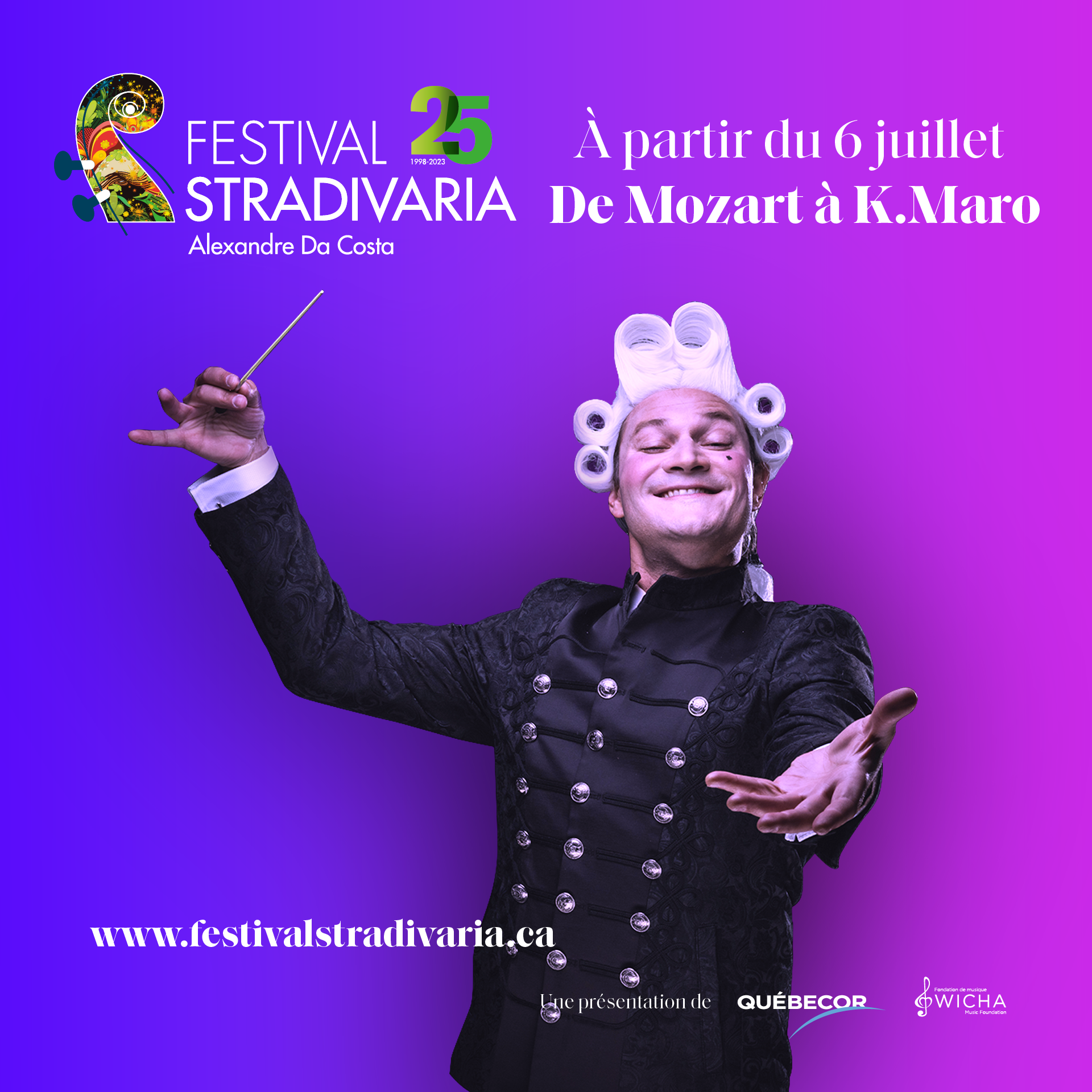 Cet été, préparez-vous à vivre la musique comme jamais auparavant! DE MOZART À K. MARO, laissez-vous porter par une programmation audacieuse, électrisante et inoubliable. Dès le 6 juillet 2025, le Festival Stradivaria s’élance dans les Laurentides… puis part à la conquête du Québec! Au programme : des concerts grandioses, des lieux à couper le souffle en plein air, dans des églises patrimoniales et salles mythiques avec la seule mission : vous faire vibrer!