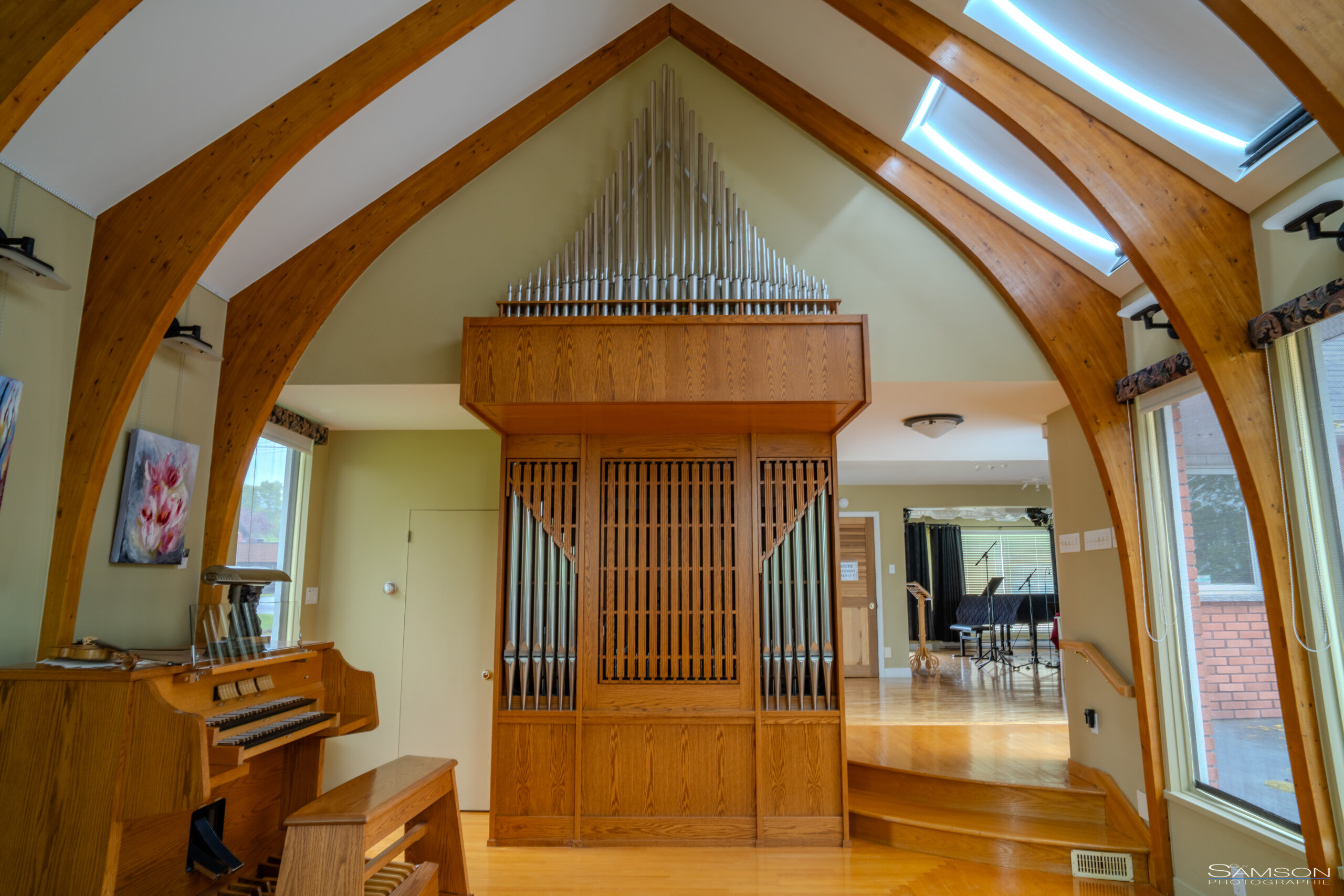 L’un des joyaux de notre salon est un orgue Casavant, instrument d’exception. Il comporte huit jeux réels répartis sur deux claviers et un pédalier complet, pour un total de 616 tuyaux. Dans un second salon, un piano à queue Esmonde White, fabriqué à Montréal, complète notre environnement sonore de qualité. Ce duo d’instruments prestigieux permet aux artistes invités de s’exprimer pleinement et d’offrir au public des performances d’une grande richesse musicale.