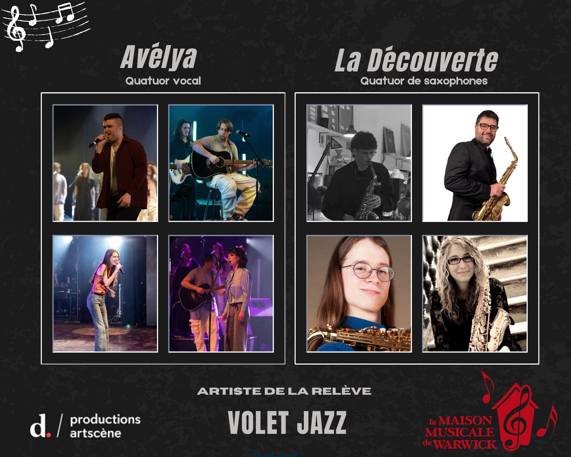 La Découverte est un quatuor de saxophones qui invite ses auditeurs à un voyage temporel et sensoriel sans précédent. Vous entendrez quatre musiciens exceptionnels du Centre-du-Québec, dont deux talents de la relève, étudiants au Cégep de Drummondville. Grâce à leur travail et leur virtuosité, cet ensemble vous fera découvrir les saxophones soprano, alto, ténor et baryton sous leurs plus belles facettes. Il vous transportera à travers l’histoire du quatuor de saxophones, qui débute au XIXᵉ siècle avec l’exploration de la richesse sonore de l’instrument à travers la musique classique, avant d’embrasser le “groove” du ragtime de 1911 et le jazz moderne du XXIᵉ siècle. La Découverte, c’est une expérience musicale qui vous fera vibrer, frissonner et, sans doute, danser ! Un spectacle à ne pas manquer.