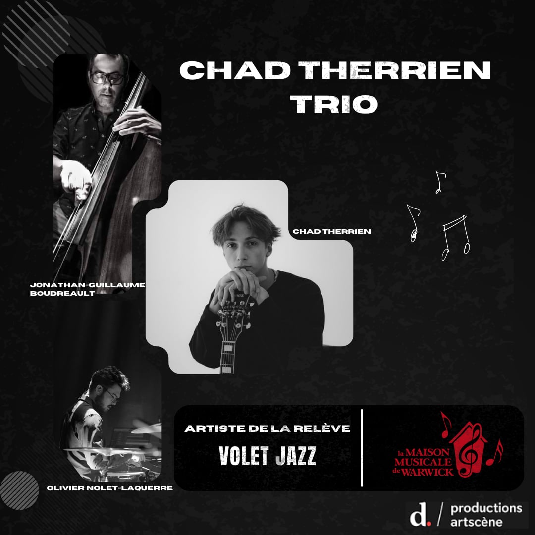 Le Chad Therrien Trio, composé de Chad Therrien à la guitare, Olivier Nolet-Laquerre à la batterie et Jonathan-Guillaume Boudreau à la contrebasse, plonge dans l’univers sonore unique qu’offre cette formation plus intime. À travers une exploration des timbres et des textures, le trio s’exprime avec profondeur, tout en honorant les grandes traditions du jazz. Cependant, loin de se limiter aux racines classiques du genre, il n’hésite pas à s’aventurer vers des sonorités plus modernes et audacieuses. Ce trio se distingue par sa spontanéité, son énergie et sa capacité à captiver le public, offrant une expérience musicale dynamique et pleine de surprises.
